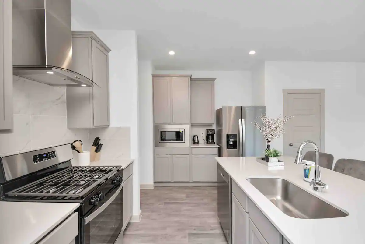 The fully equipped kitchen is a chef's delight, featuring modern appliances, sleek countertops, and all the necessary utensils and cookware to prepare delicious meals during your stay. Whether you're whipping up a quick breakfast or hosting a family dinner, this kitchen has everything you need.