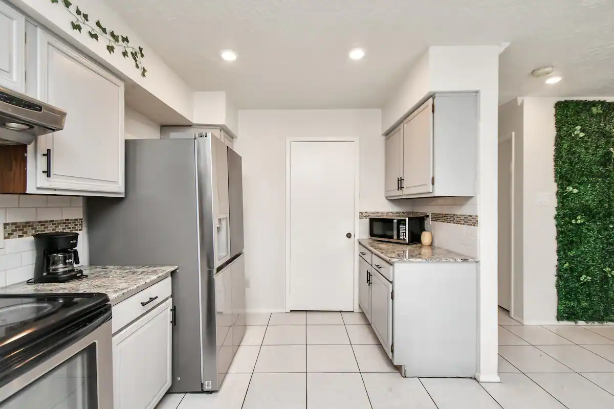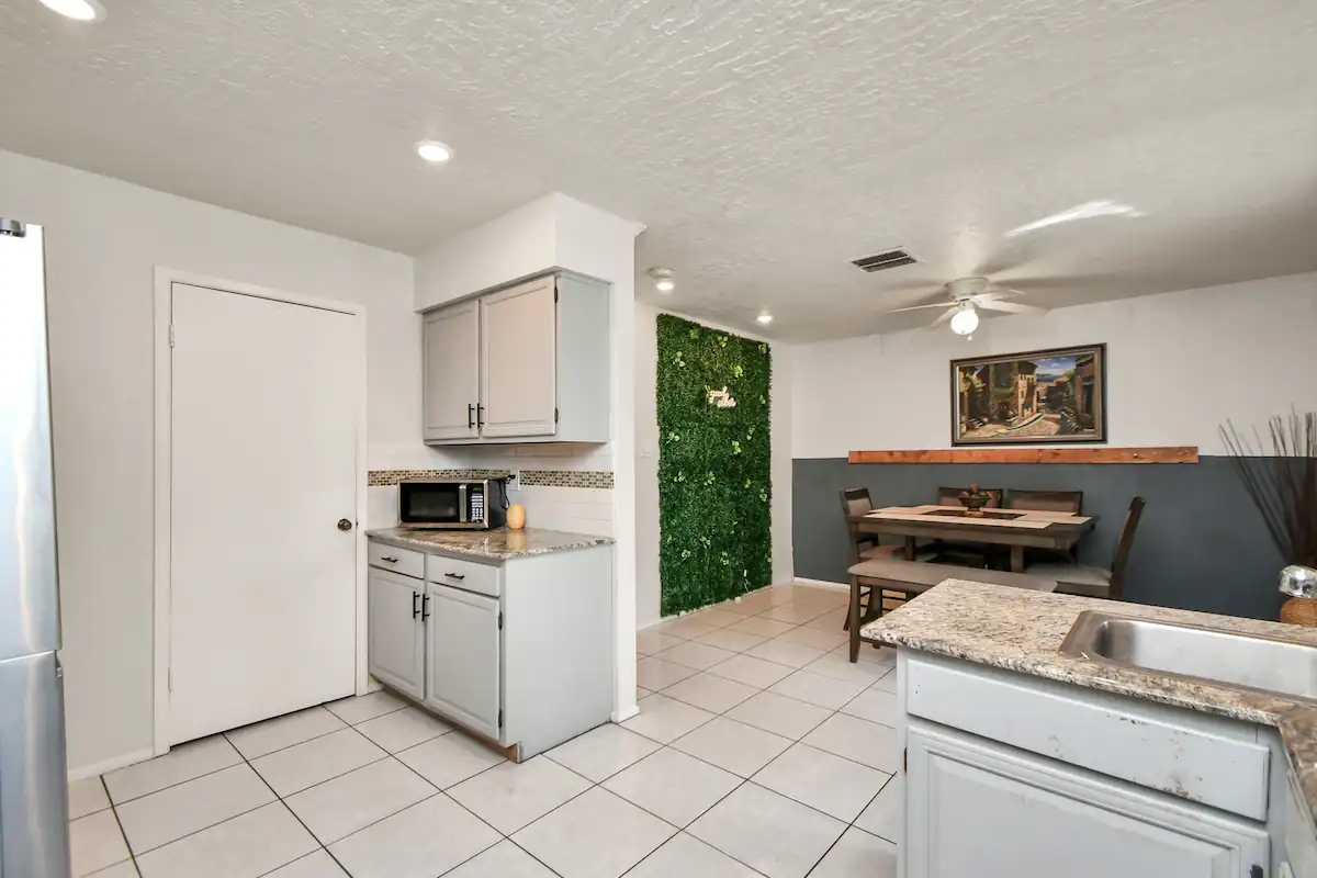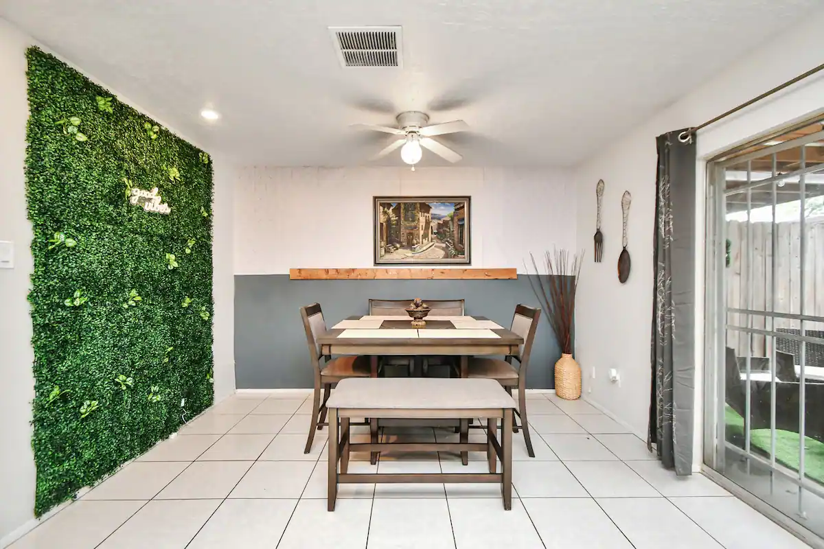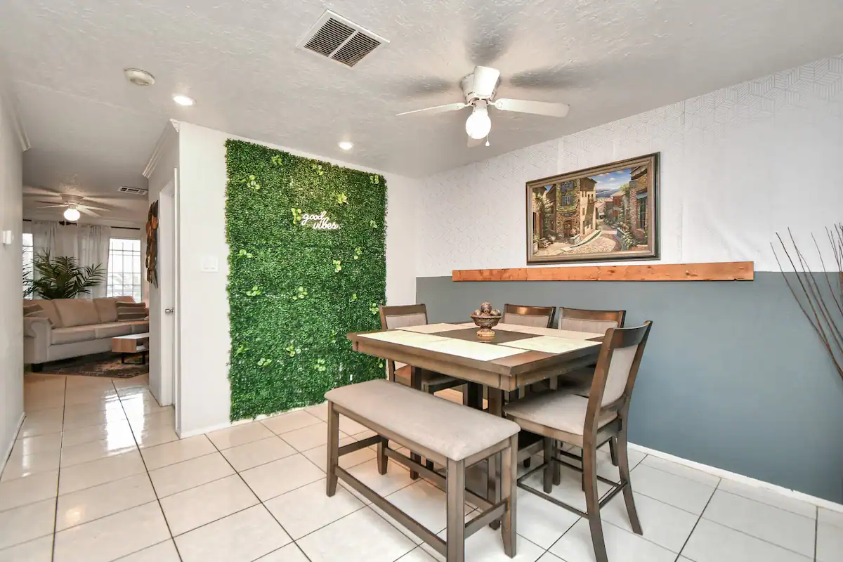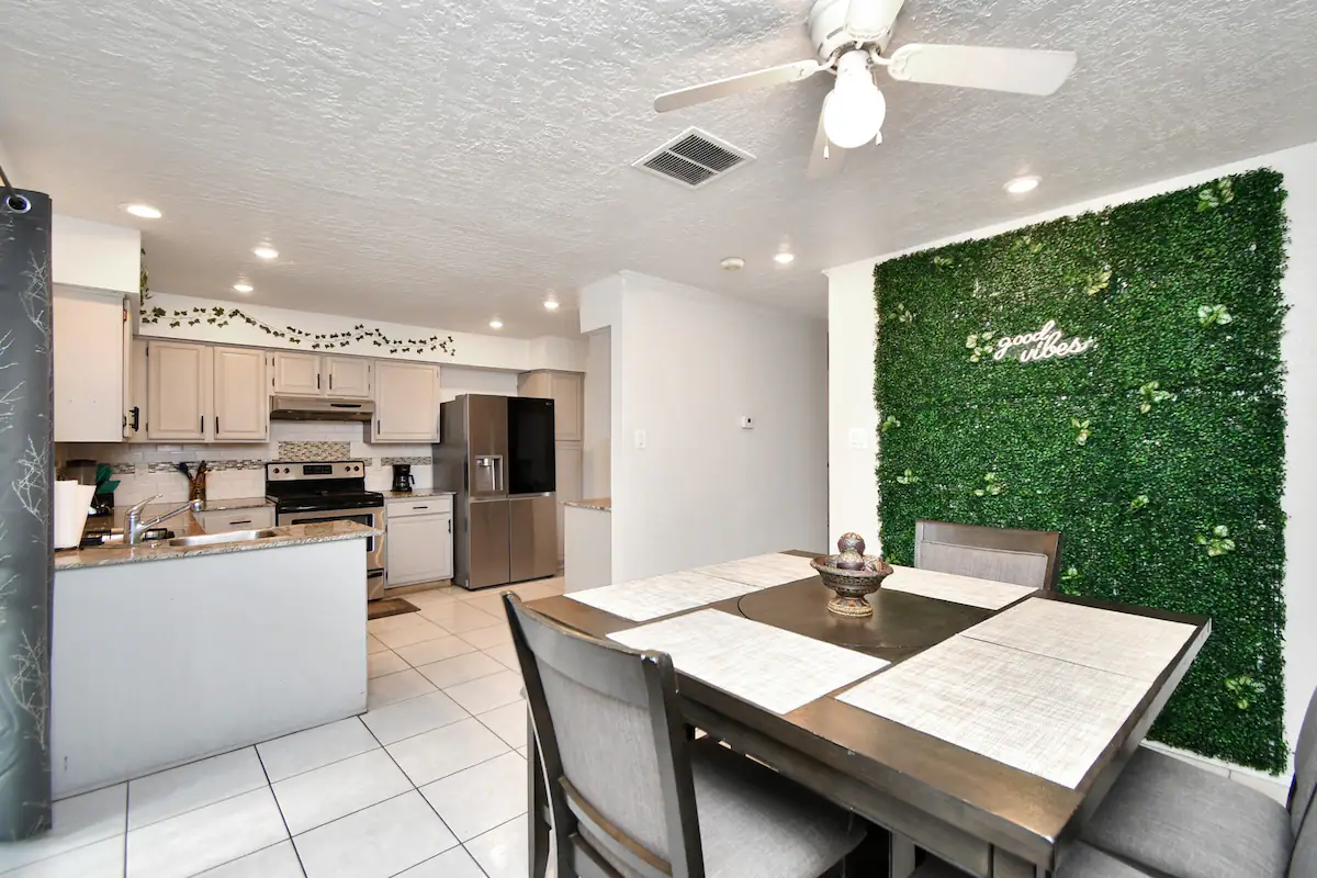 The bright and spacious kitchen is fully equipped with all the appliances, utensils, and cookware you need to feel at home. The dining area features a grass wall for a photo opportunity after a nice brunch.