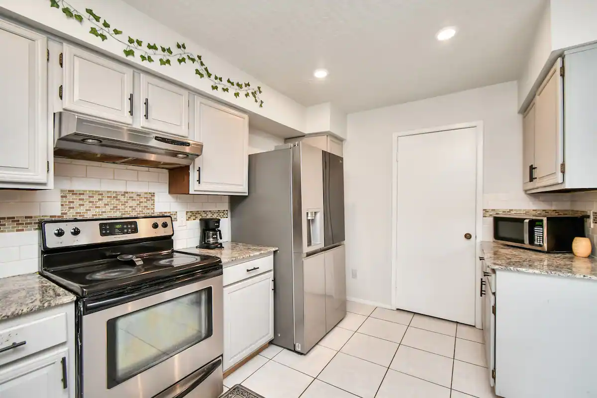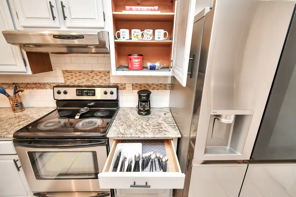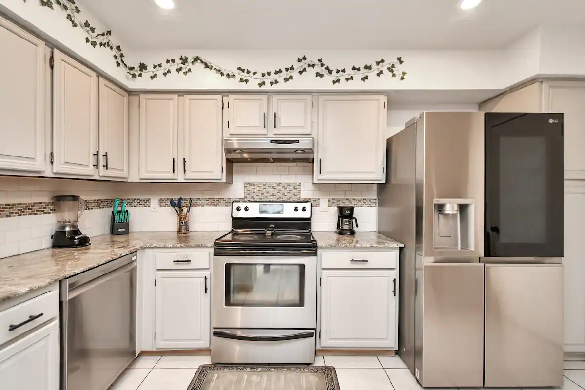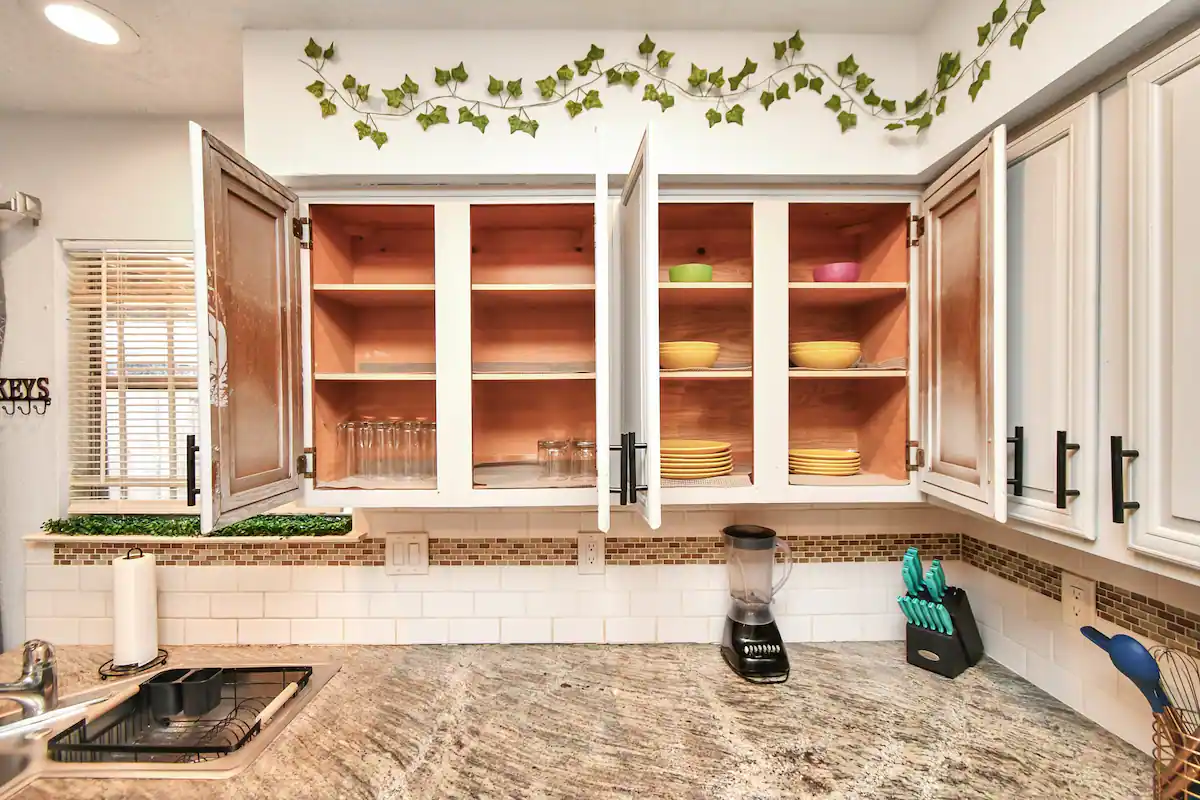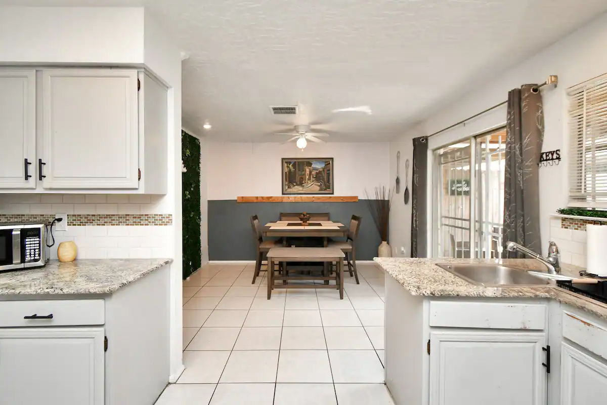 The bright and spacious kitchen is fully equipped with all the appliances, utensils, and cookware you need to feel at home. The dining area features a grass wall for a photo opportunity after a nice brunch.