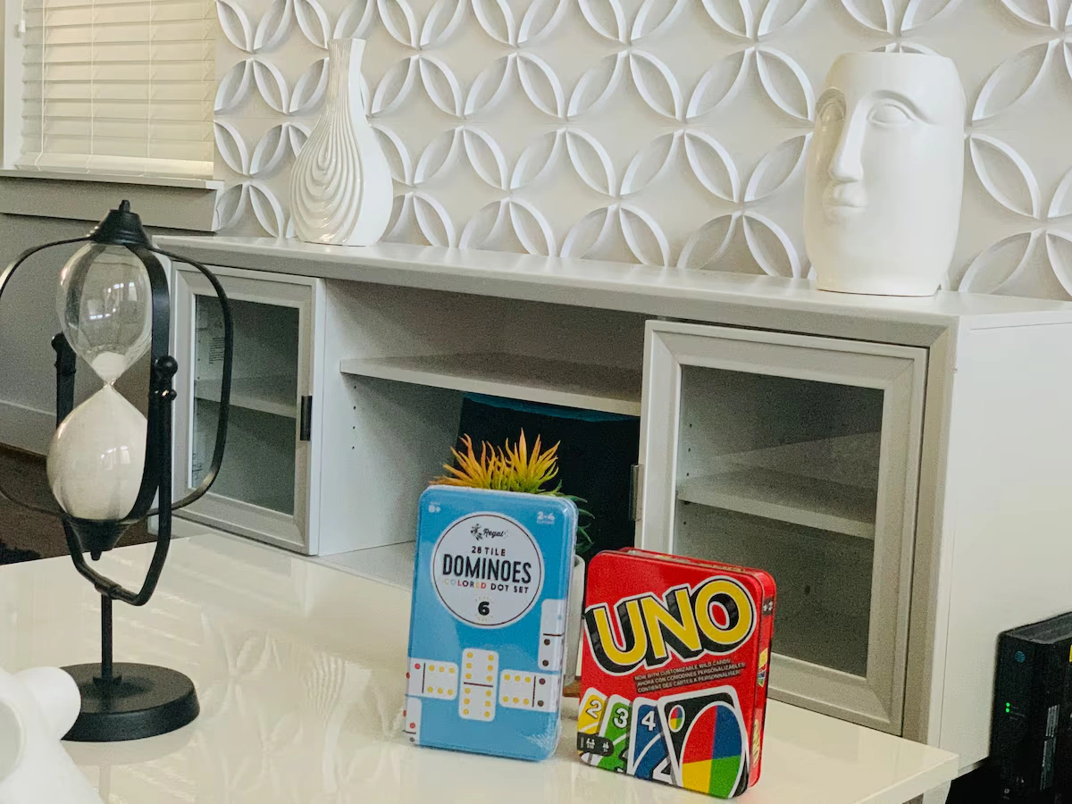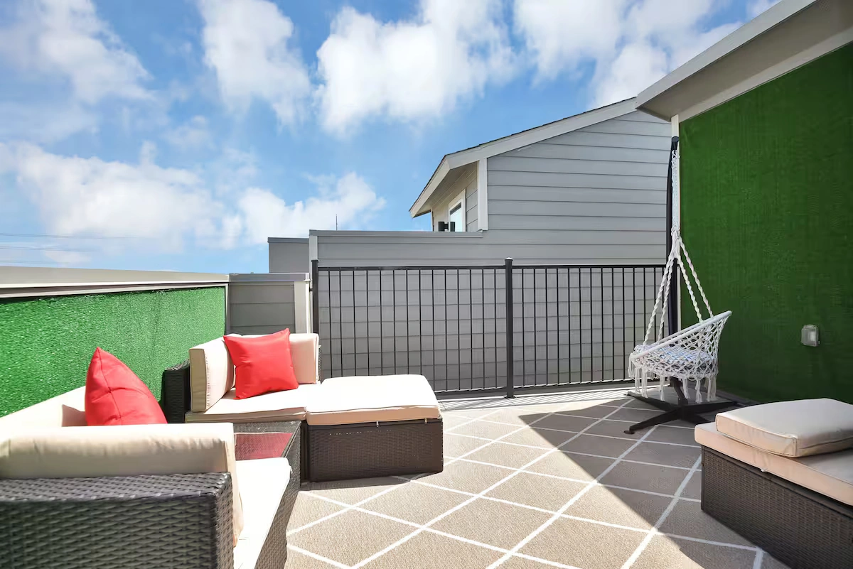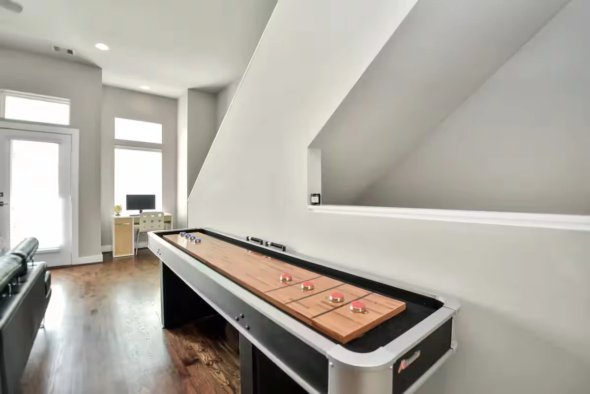 With a rooftop balcony that has an atmosphere like no other, enjoy games like Jenga & Shuffleboard. BBQ grill in place. Home is stylish & comfortable, private two car garage, & tons of street parking.